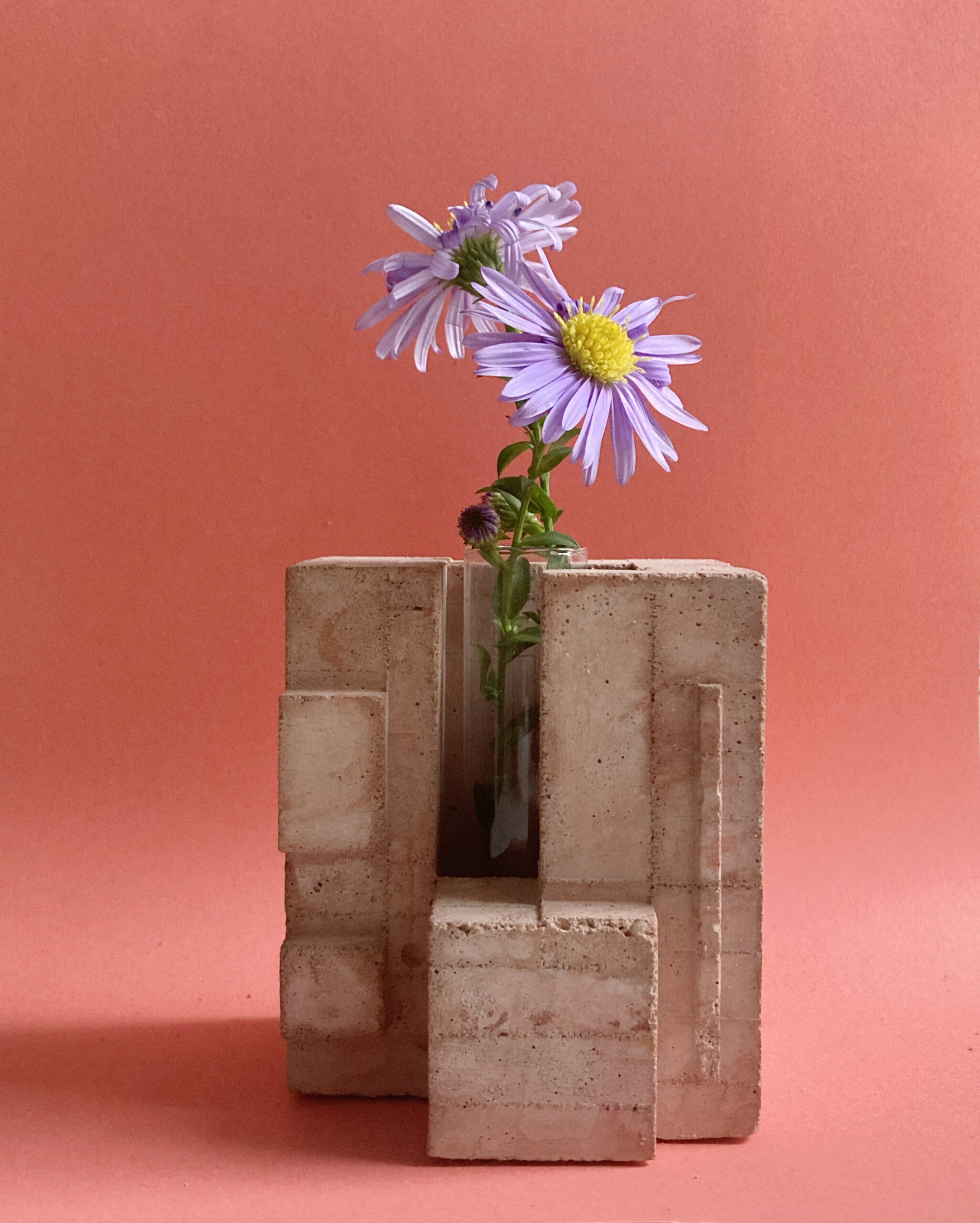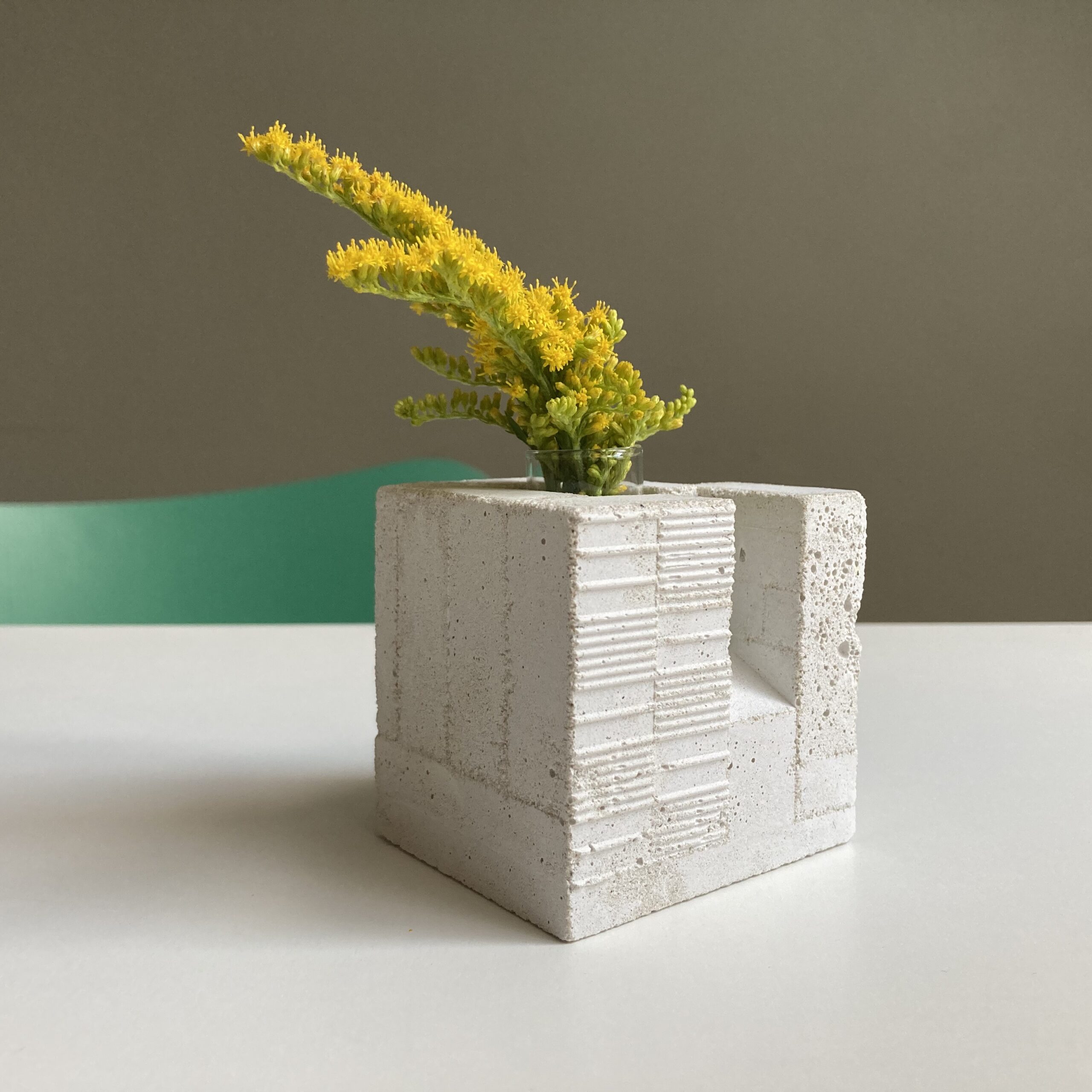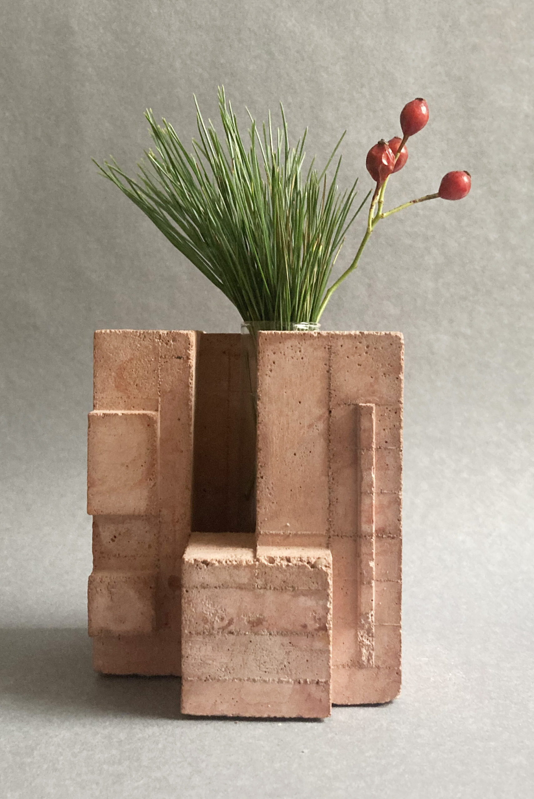Das Räucherhaus aus Beton ist auf der Basis von Steckbausteinen entstanden. Durch die Steine ermöglichte es mir in einem System zu arbeiten – somit kann man die Häuser auch stapeln und den Räucherturm verlängern. Nachdem die Weihnachtszeit vorbei ist kann man das Haus einfach umdrehen und durch das Reagenzglas zu einer Vase umfunktionieren.